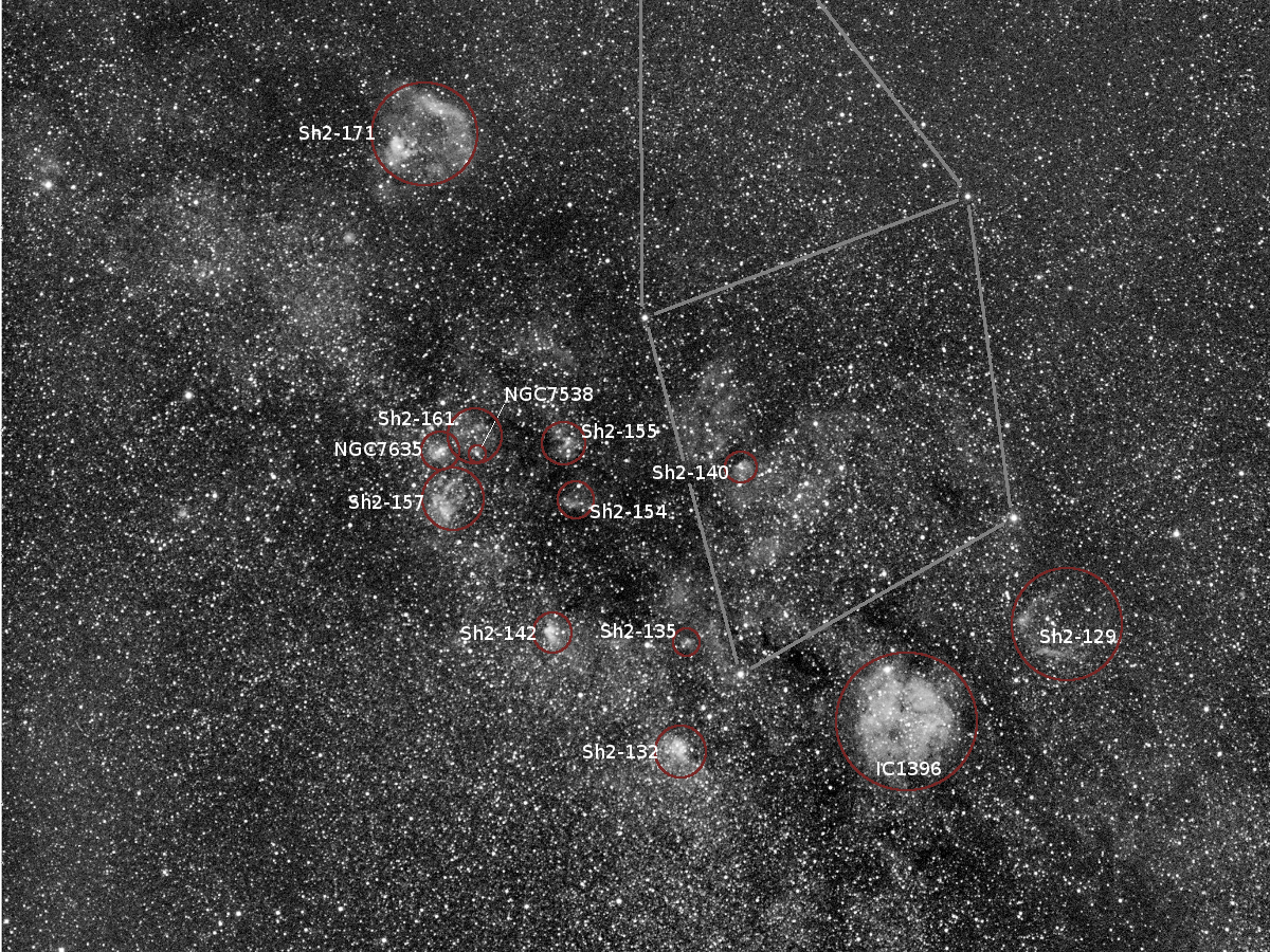 11x240s belichtet, Durchzug von Schleierwolken, schlechte Transparenz, viele H-Alpha-Objekte beschriftet
