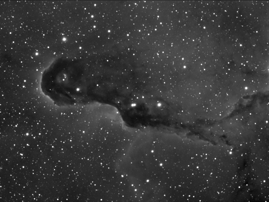 Die markannte Staubsäule ist gut zu sehen, die schwächeren deuten sich links im Bild an. Unten rechts im Bild befindet sich der kleine helle Nebel NGC 6820.