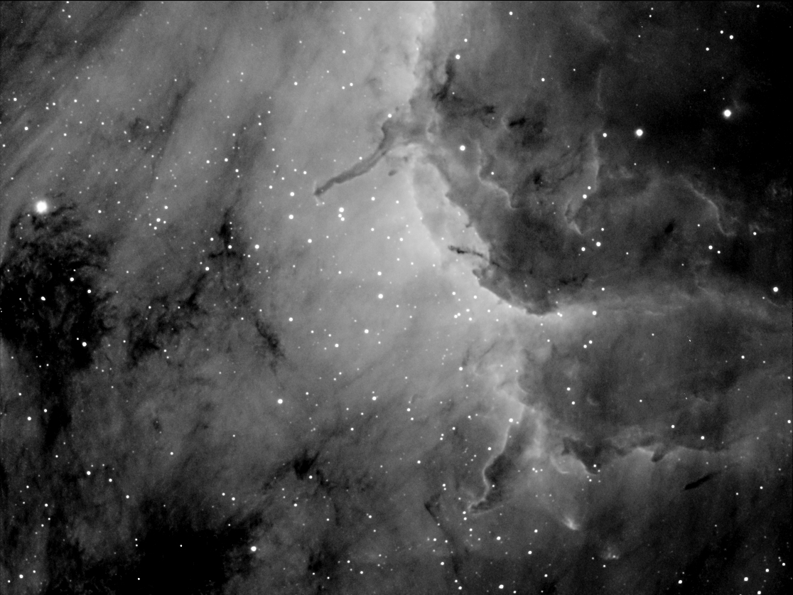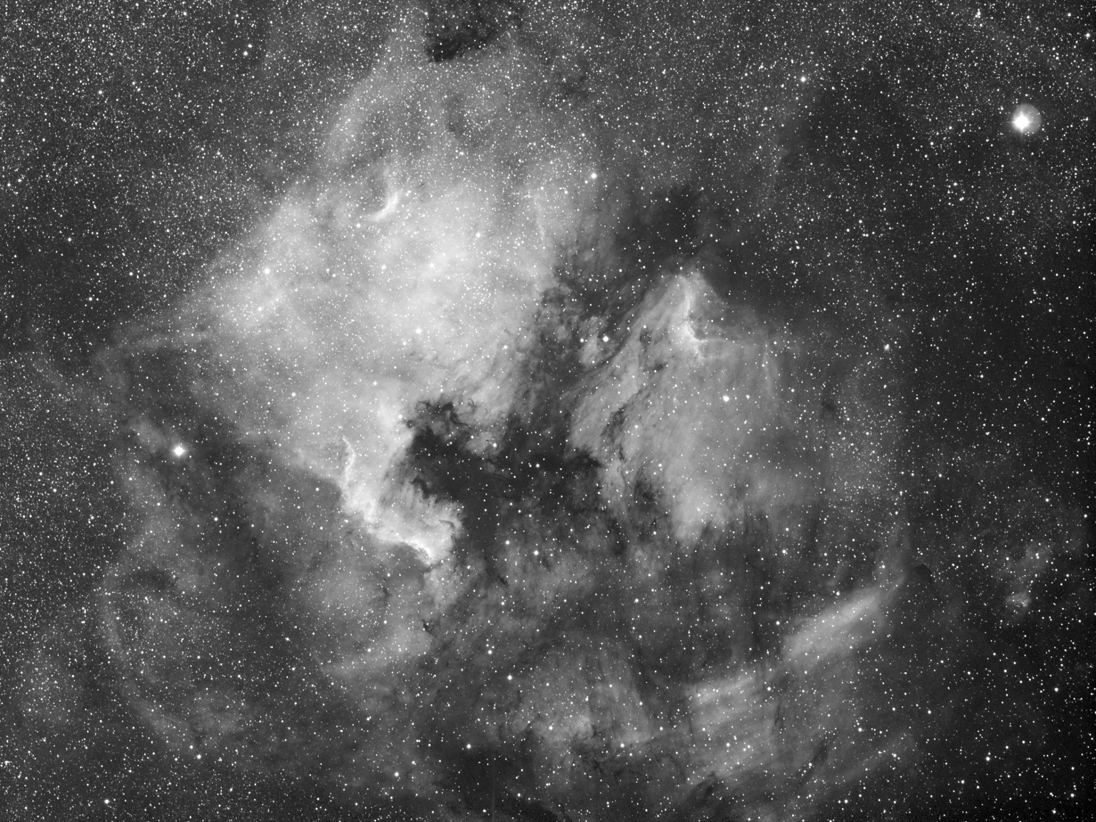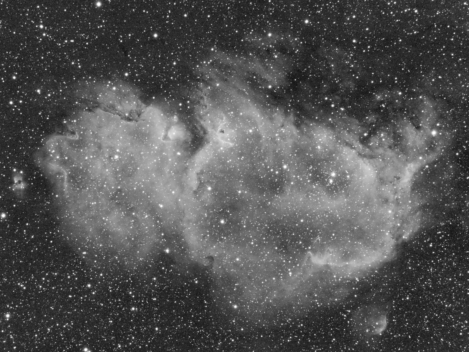 31.07.2020 23:48 - 03:12 Uhr MESZ, Omegon Photoscope 72/432 mm auf Taurus GM-60, Moravian G2-8300FW, 2x2 Binning mit Flattener, H-Alpha-Filter, 40x300 s belichtet, Autoguiding mit DMK 21AU04.AS und PHD2;