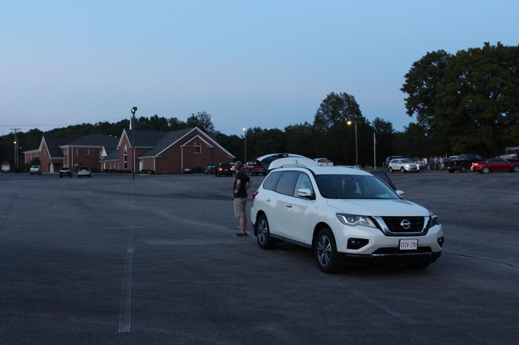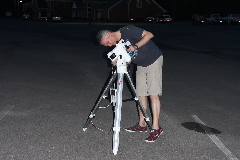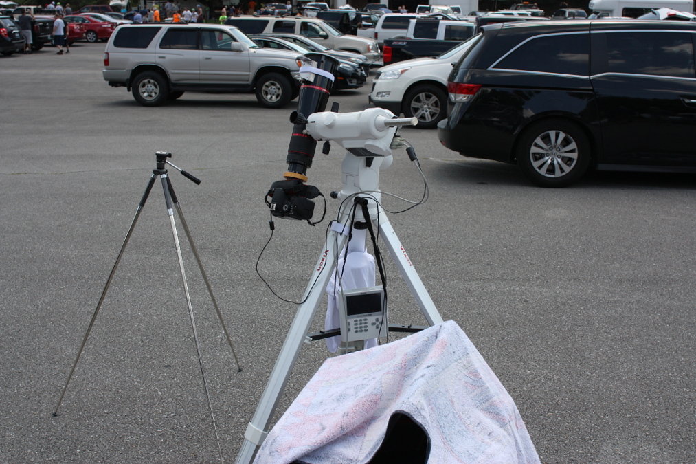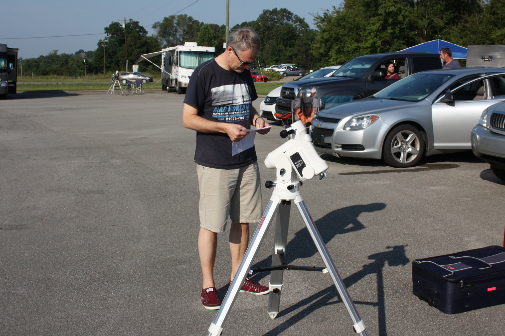 Am Vorabend der Finsternis fuhren wir zum Beobachtungsplatz, um diesen zu erkunden und um die Polhöhe der Montierung einzustellen. Letzteres geht nur einigermaßen genau, wenn der Polarstern sichtbar ist. Zu unserer Freude war der Platz öffentlich zugänglich und es hatten sich bereits Beobachter eingefunden. Bei Einbruch der Dunkelheit baute ich meine Montierung auf.