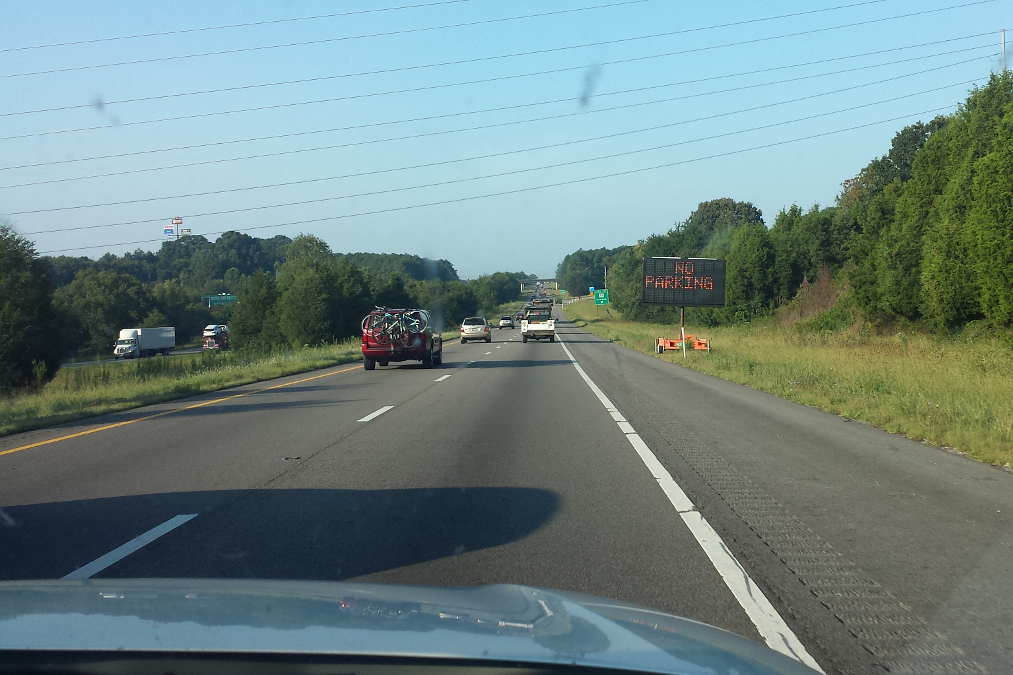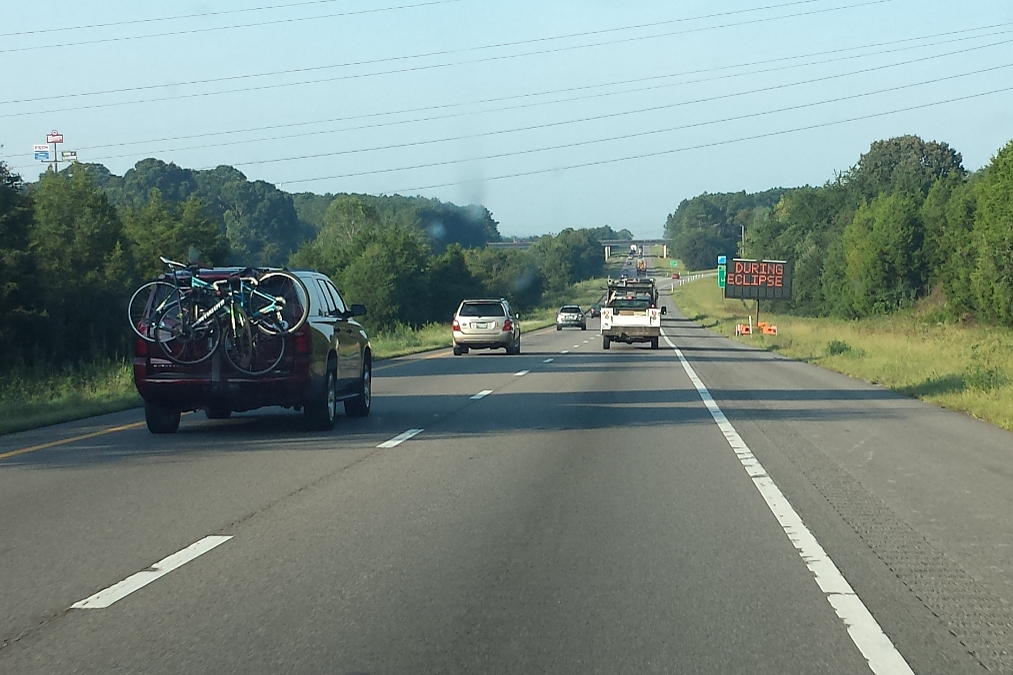 Auf der Fahrt von Knoxville zum Beobachtungsplatz wiesen Schilder innerhalb des Schattenpfads am Straßenrand darauf hin, dass dort das Parken währende der Finsternis verboten ist: