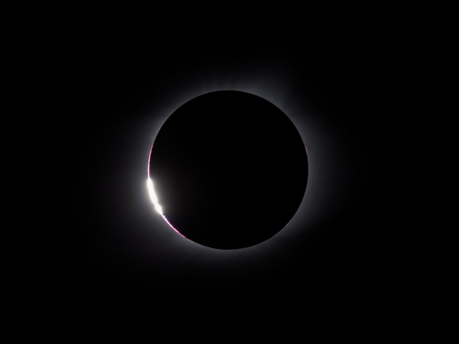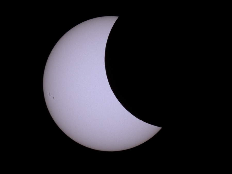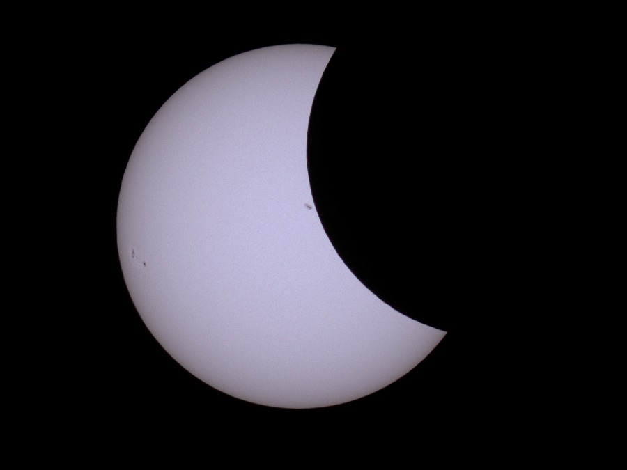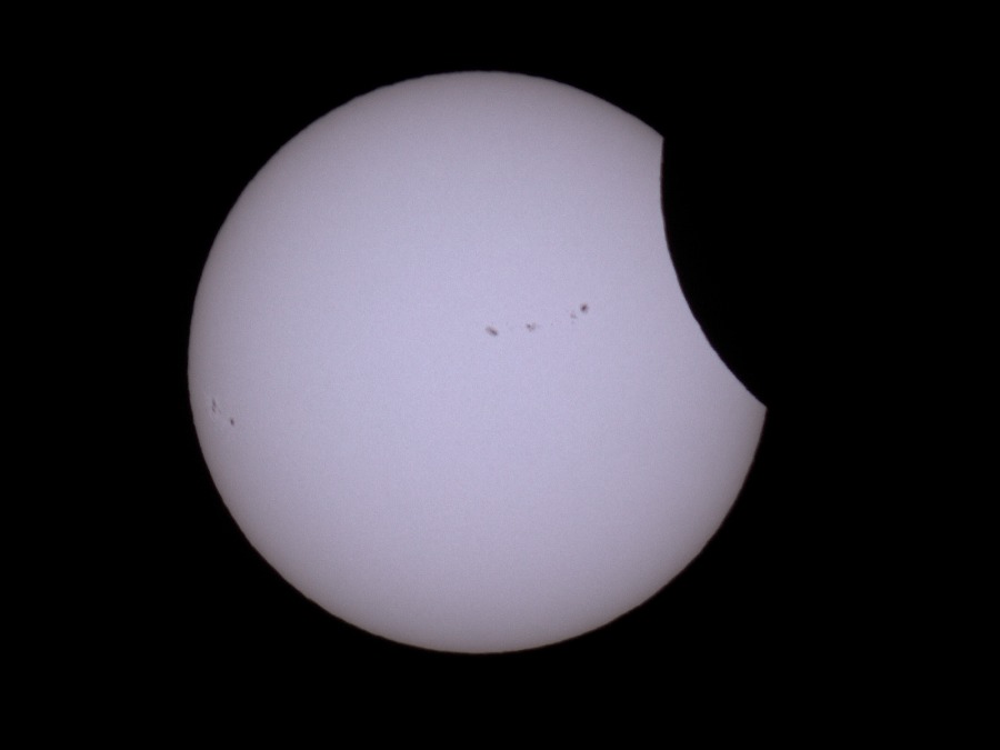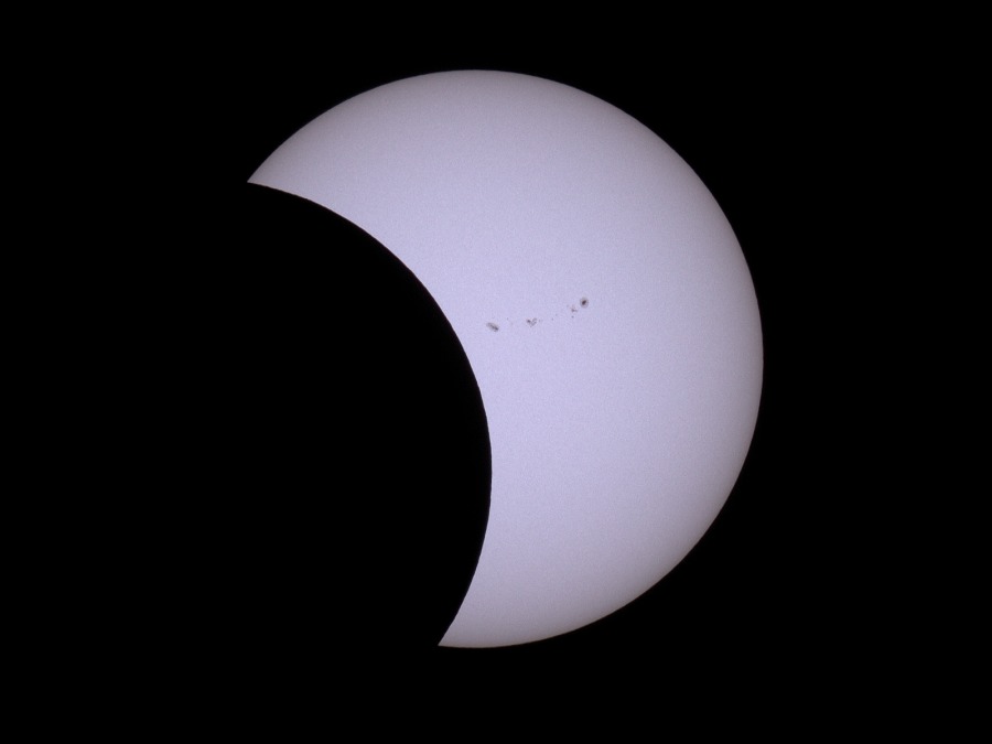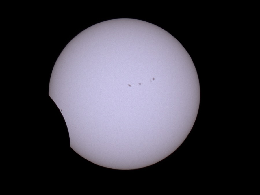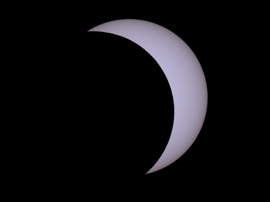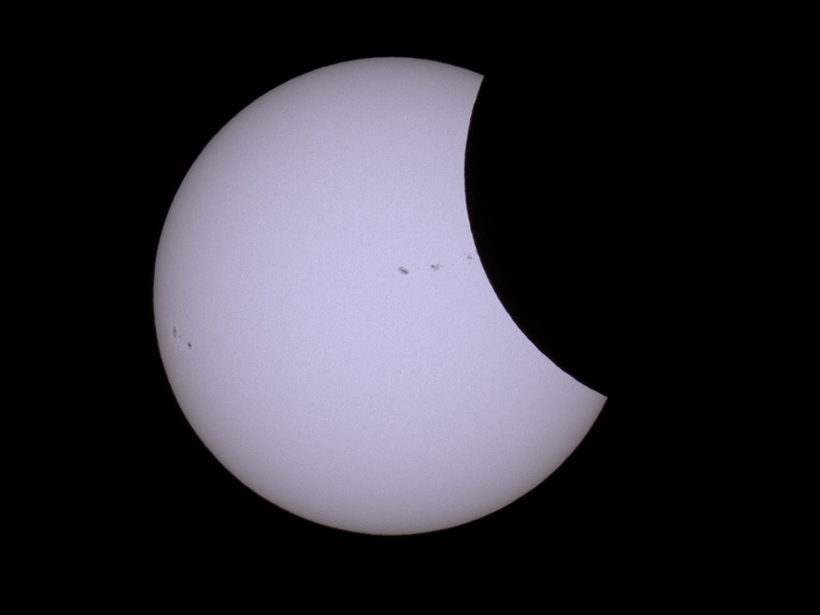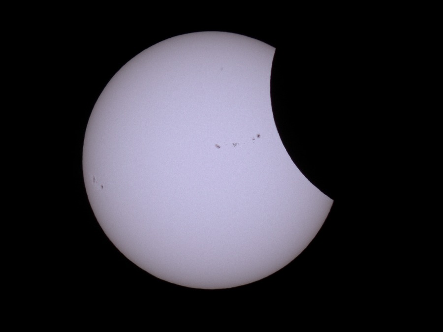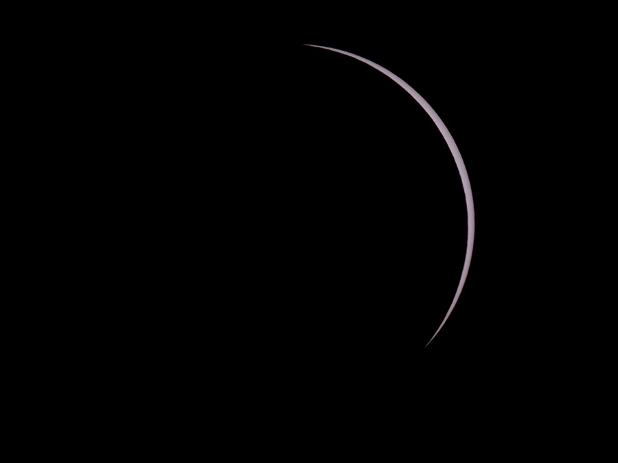 des Sonnenfilters kurz vor und kurz nach der Totalität. Ca. 20 Minuten vor der Totalität wurden der Kamera-Akku gewechselt und nochmal nachfokussiert. Hinterher zeigte sich, dass das richtig war, der Fokus war noch besser getroffen als zu Beginn der Finsternis.