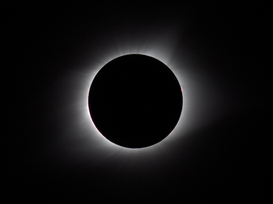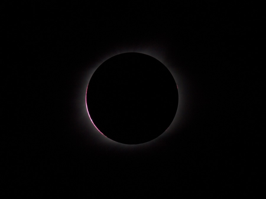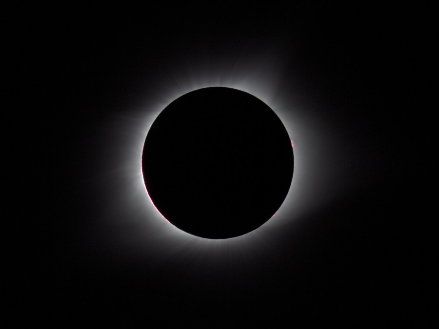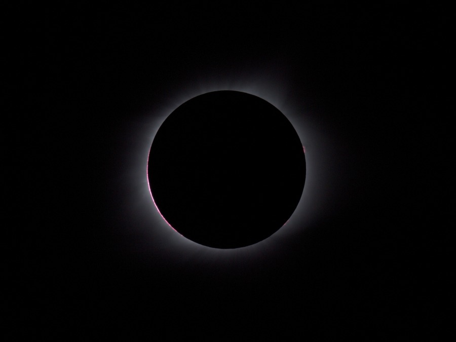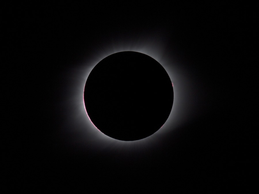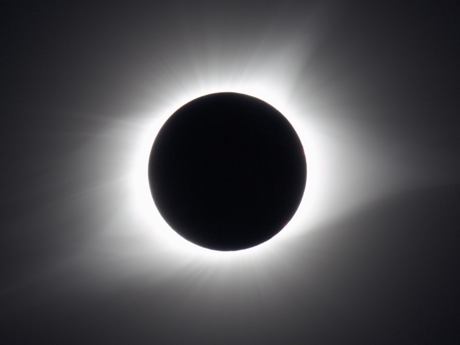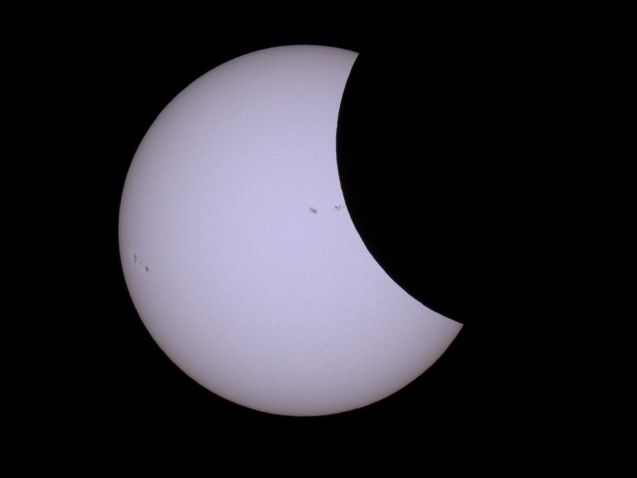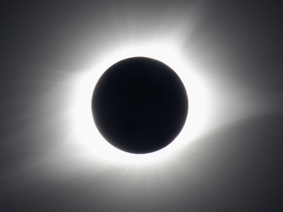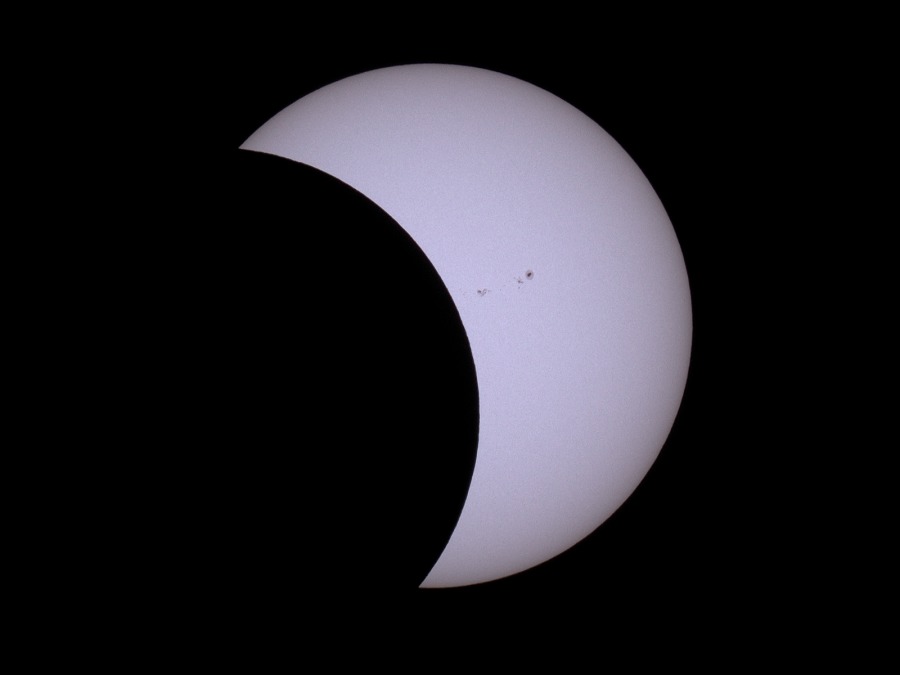 des Sonnenfilters kurz vor und kurz nach der Totalität. Ca. 20 Minuten vor der Totalität wurden der Kamera-Akku gewechselt und nochmal nachfokussiert. Hinterher zeigte sich, dass das richtig war, der Fokus war noch besser getroffen als zu Beginn der Finsternis.