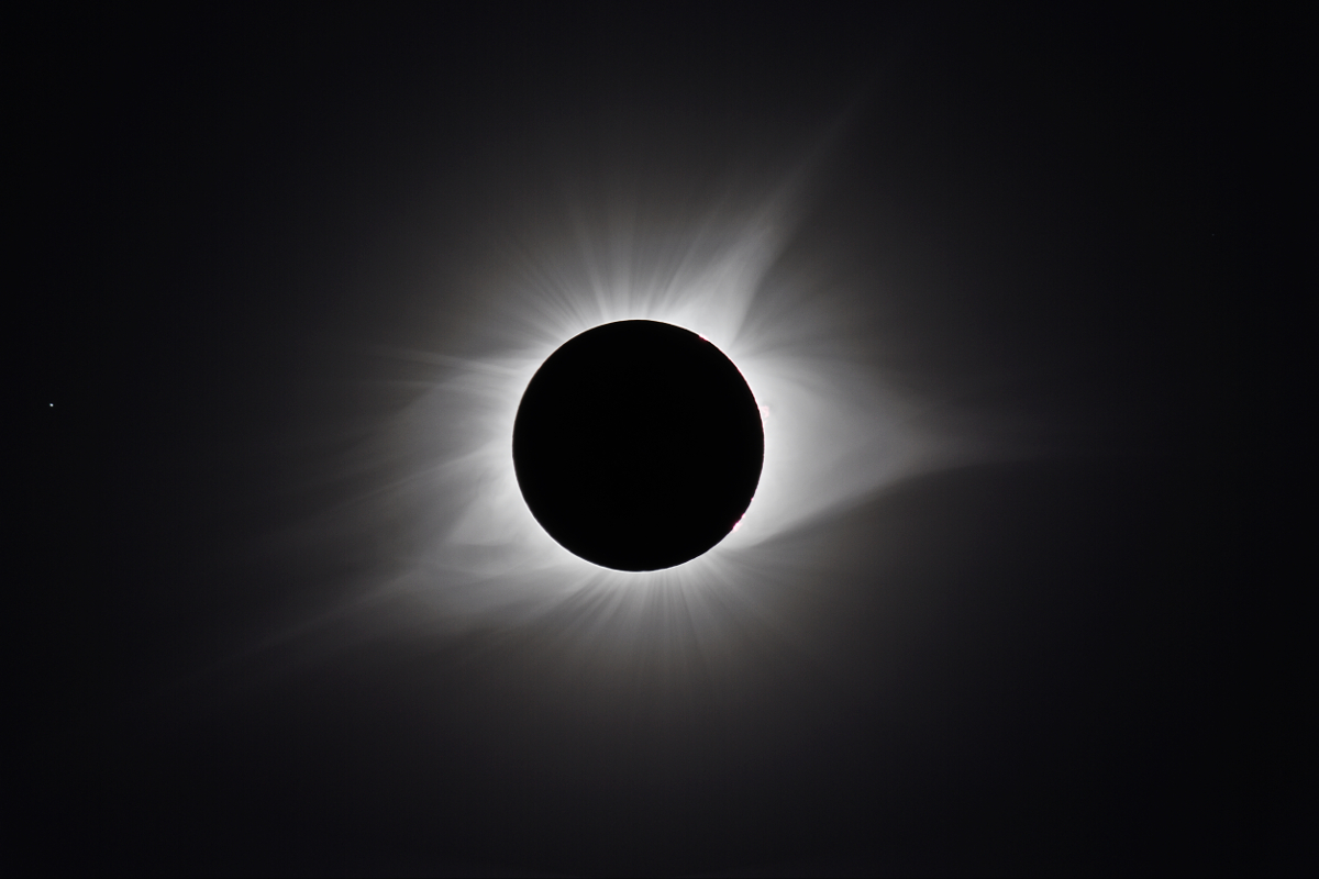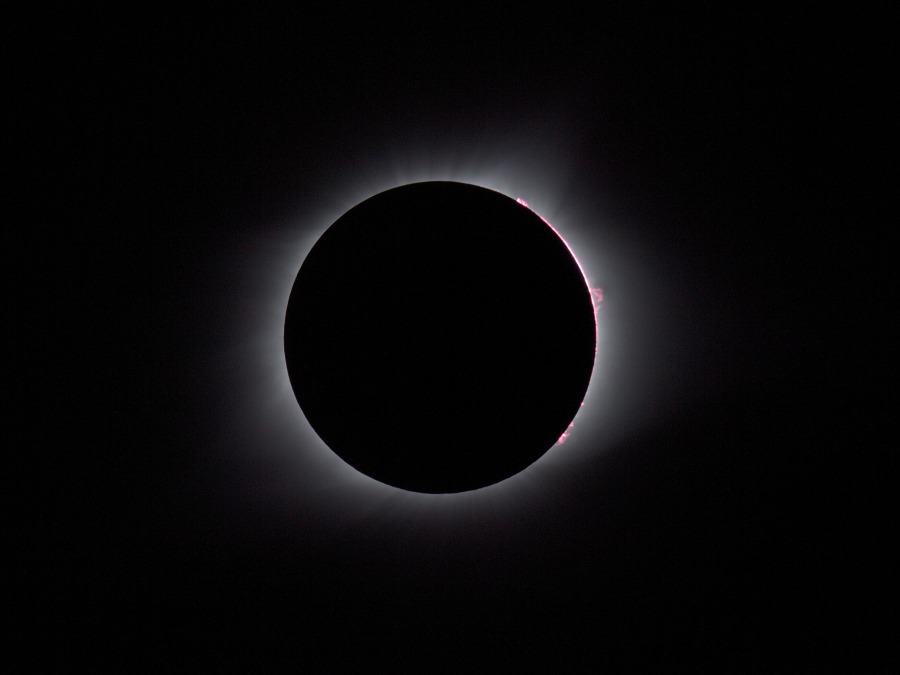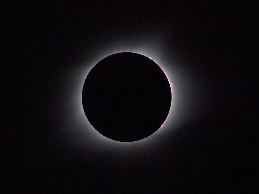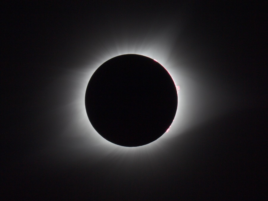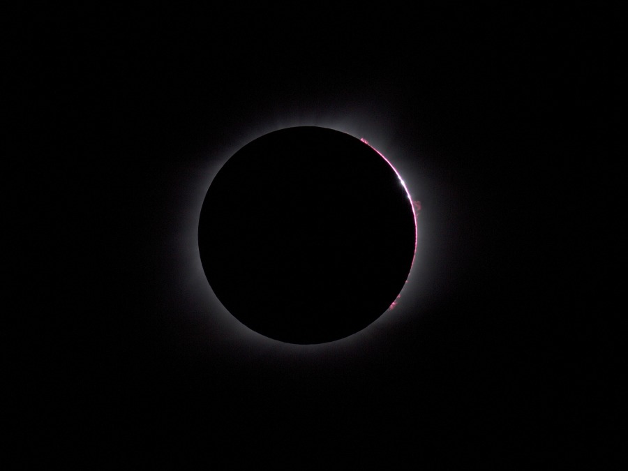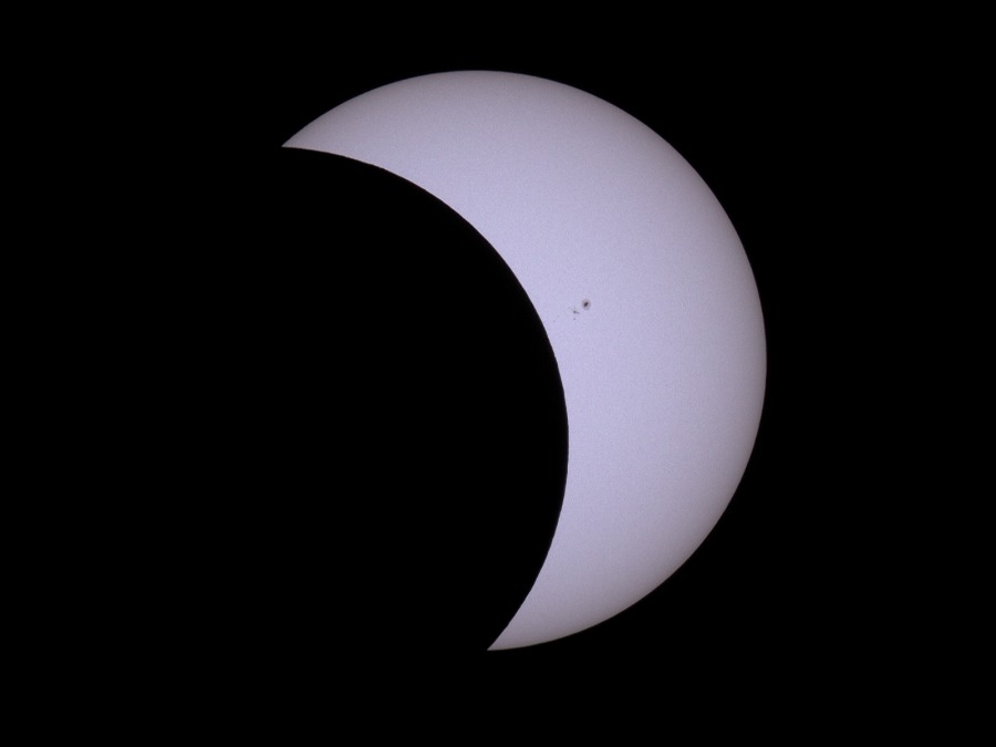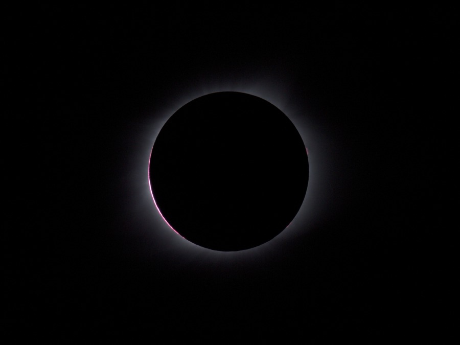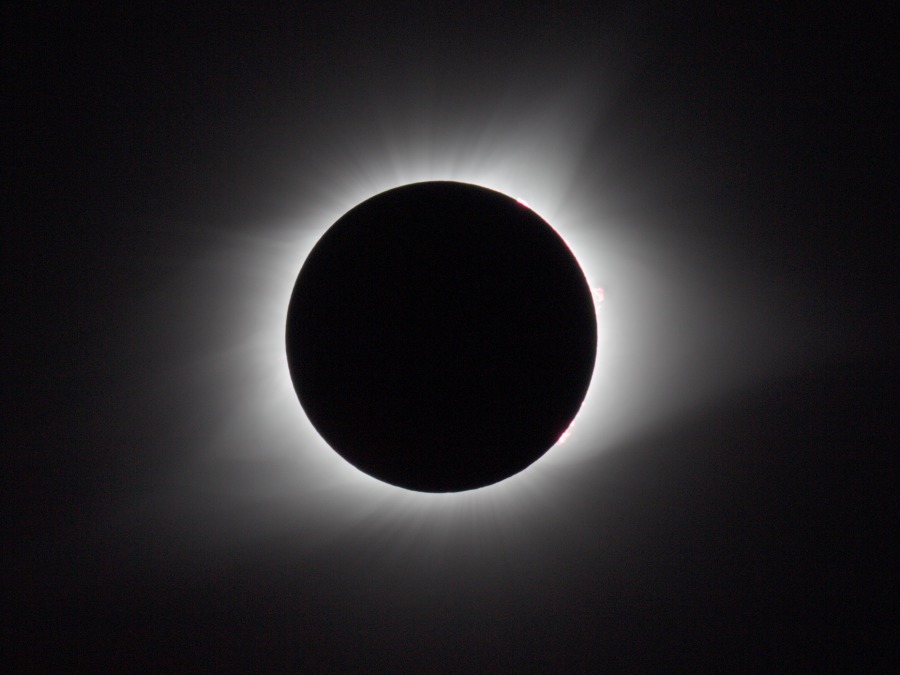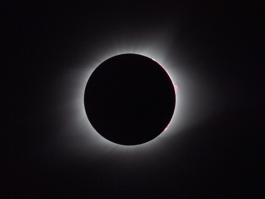 des Sonnenfilters kurz vor und kurz nach der Totalität. Ca. 20 Minuten vor der Totalität wurden der Kamera-Akku gewechselt und nochmal nachfokussiert. Hinterher zeigte sich, dass das richtig war, der Fokus war noch besser getroffen als zu Beginn der Finsternis.