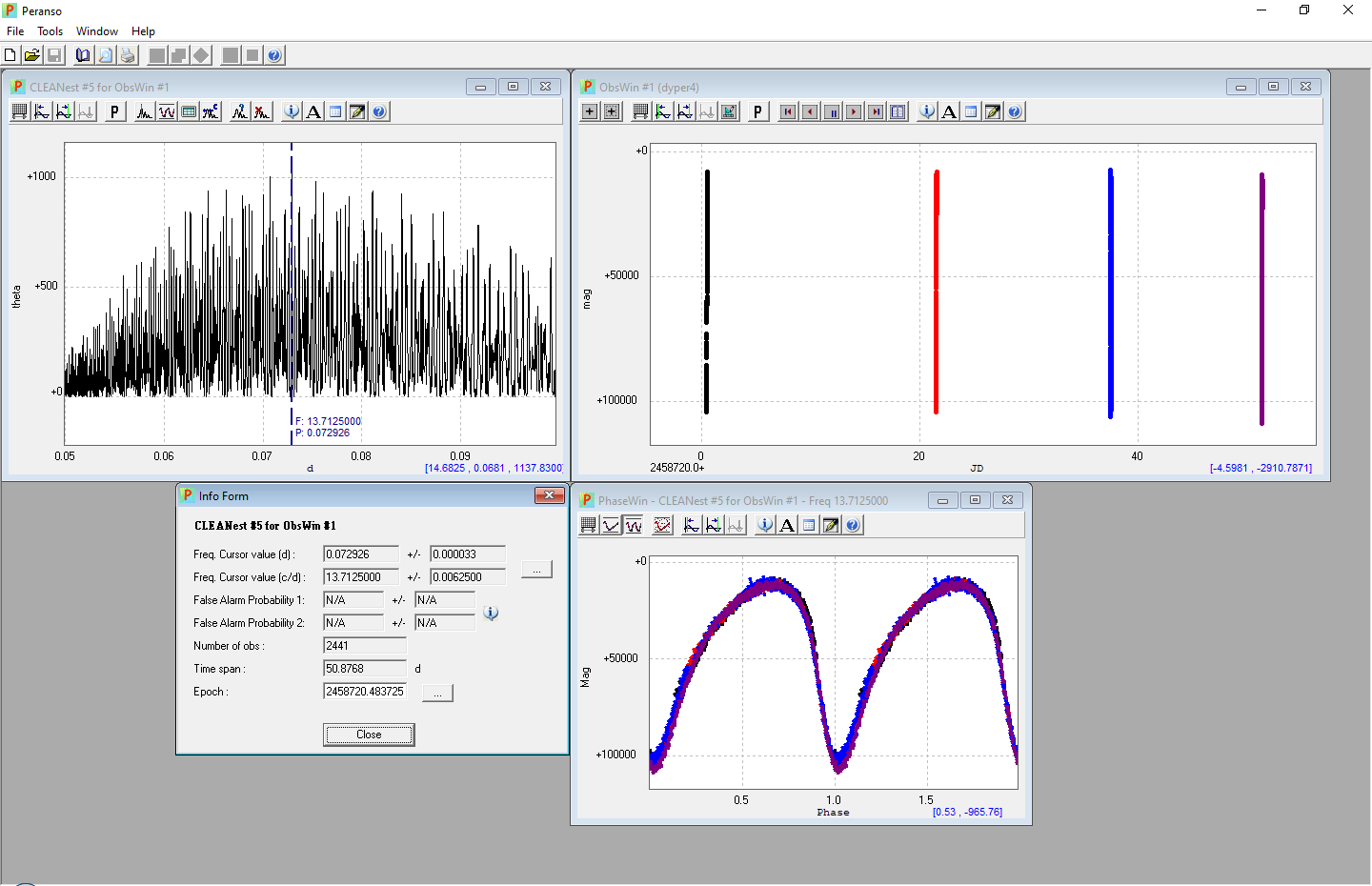 Die Software bietet verschiedene Methoden an, die die Auswertung periodischer Lichtwechsel erlauben. Einen Überblick gibt der Artikel von Paunzen und Vanmunster, siehe [3]. Für die Auswertung der Lichtkurven von DSCT-Sternen eignet sich der CLEANest-Algorithmus am besten, der von Foster 1995 etabliert wurde [4]. Werden die Daten aus allen vier Sessions ins Programm geladen, wird nach Ausführung des genannten Algorithmus die Periode von DY Peg sofort mit hoher Präzision gefunden.