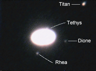 Saturn selbst ist natürlich überbelichtet, aber die Monde sind sichtbar: